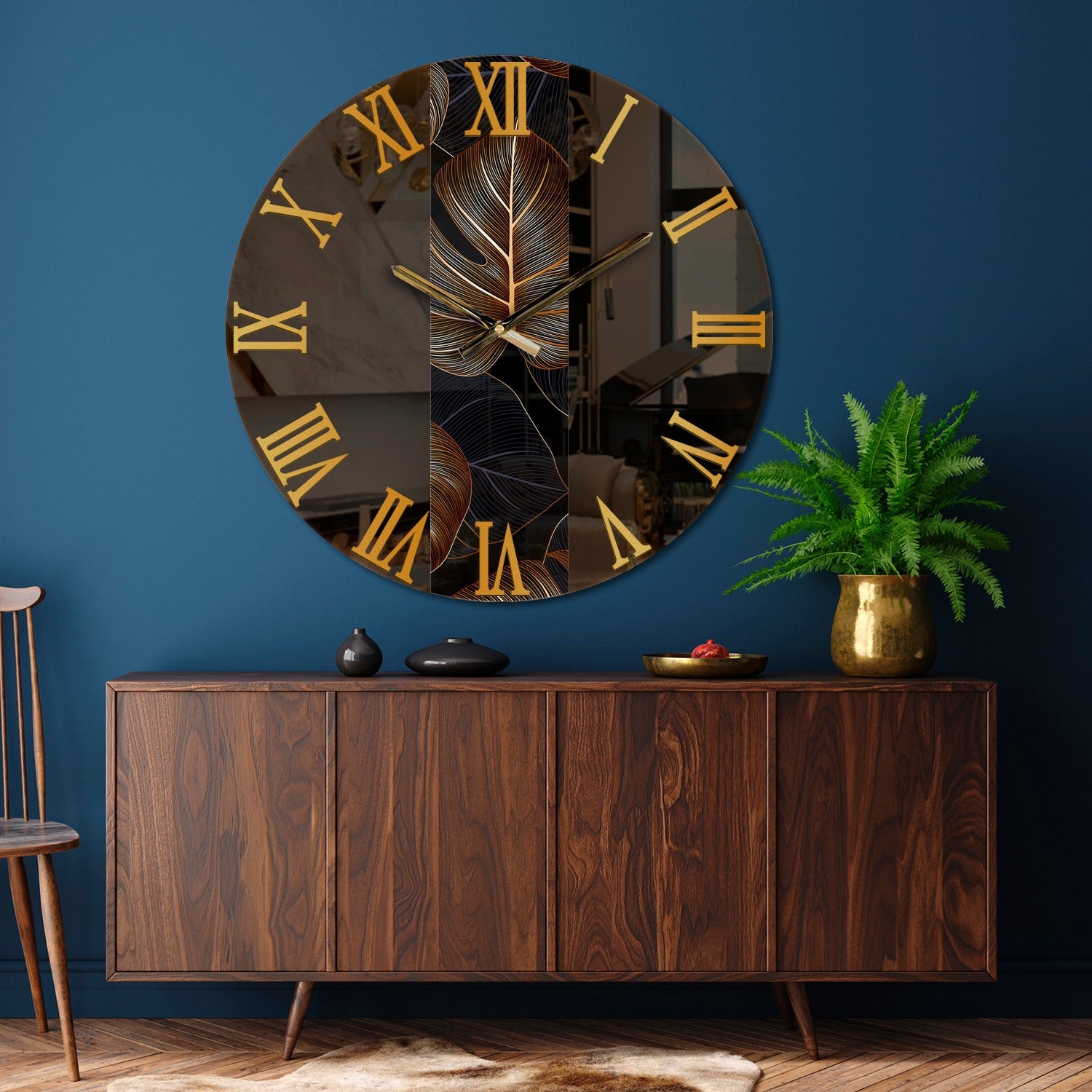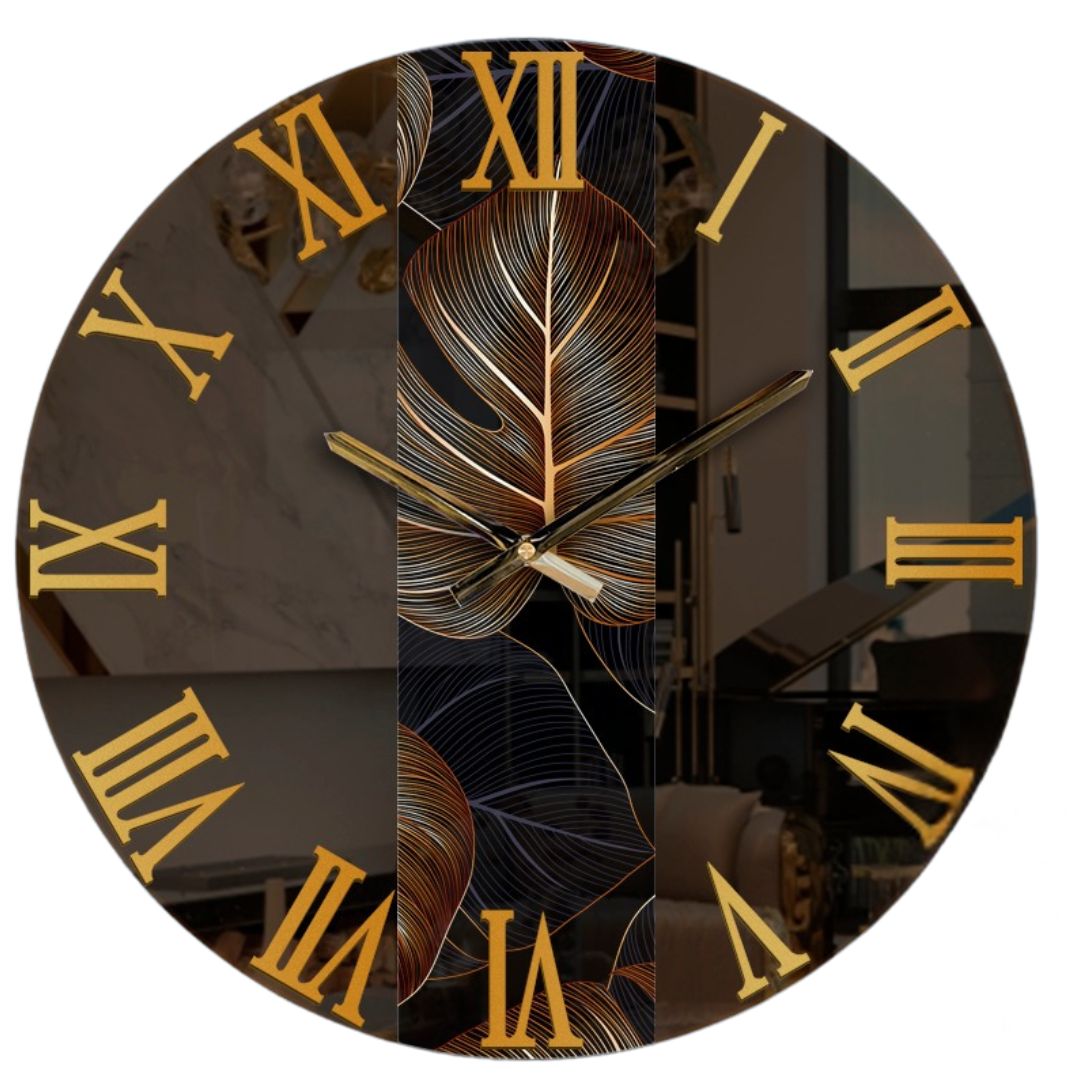 Elegante orologio specchio dalla forma circolare, arricchito da applicazione in resina lucida centrale decorata in foglia oro. Meccanismo made in italy