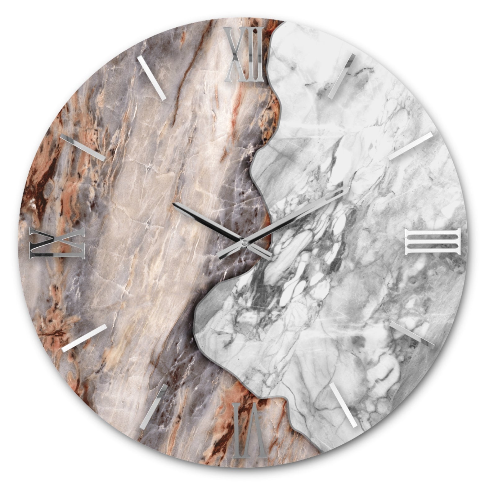 Orologio circolare con quadrante lucido, decorato a mano con foglia oro/argento e numeri sovrapposti in Plex lucido con effetto specchio.